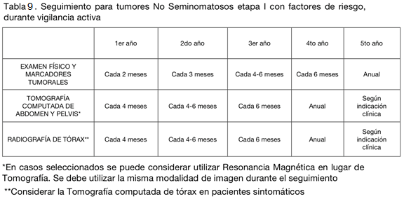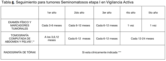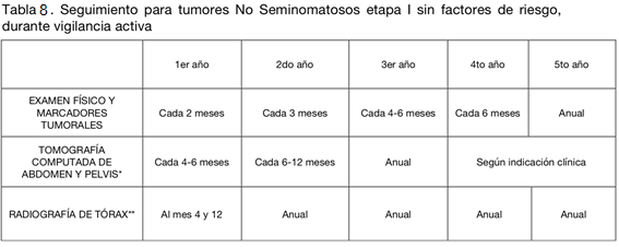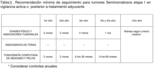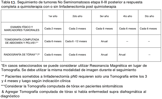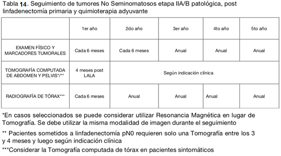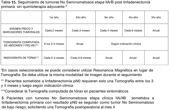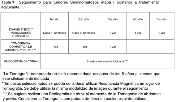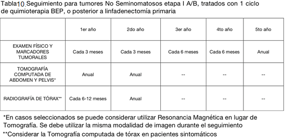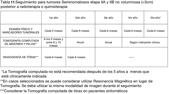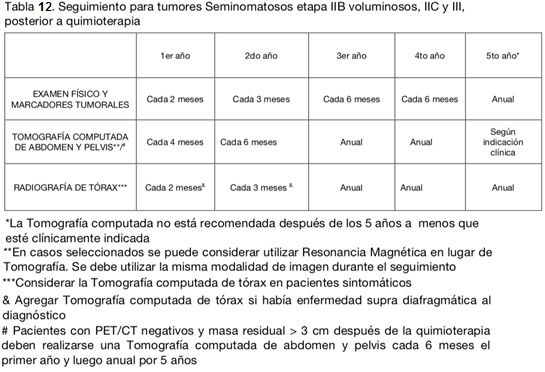 En el caso de seminoma etapa IIB con enfermedad voluminosa, la NCCN sugiere el uso de QMT como tratamiento adyuvante, mientras que en la enfermedad no voluminosa IIB y en etapa IIA, QMT y RDT. Además, en los casos de la enfermedad no voluminosa, las recurrencias son poco frecuentes y ocurren generalmente dentro de los 3 primeros años. Esto determina variaciones en la frecuencia del seguimiento (tablas 11 y 12).