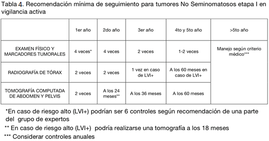 La estrategia de seguimiento varía levemente dependiendo de la presencia de factores de riesgo: LVI, compromiso del cordón o del escroto. Sin embargo, VA sería más apropiada en los pacientes sin factores de riesgo.