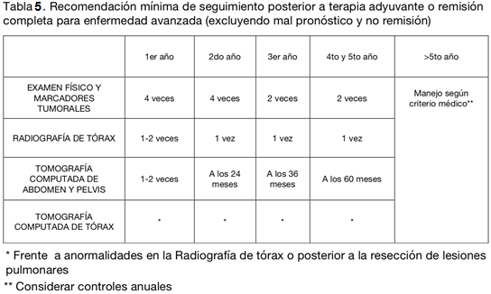 La imagenología de tórax se solicita sólo si está clínicamente indicada dado que la recurrencia se diagnostica por TAC o, menos frecuentemente, por elevación de los marcadores tumorales.